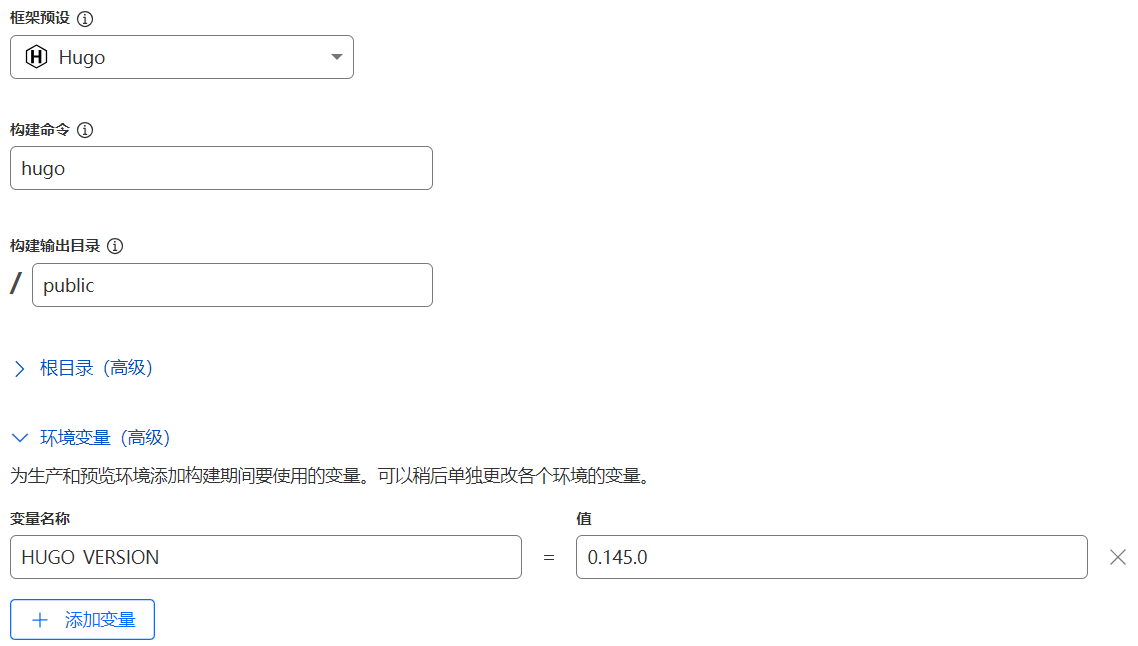 然后按照如下图选择框架Hugo,添加环境变量HUGO_VERSION,值为上面使用命令查看的一大串中的数字
